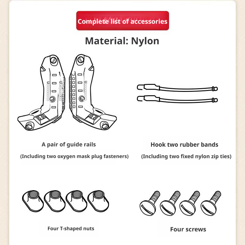 Product configuration: One pair of guide rails + Two rubber bands with hooks + Four T-type nuts + Four screws